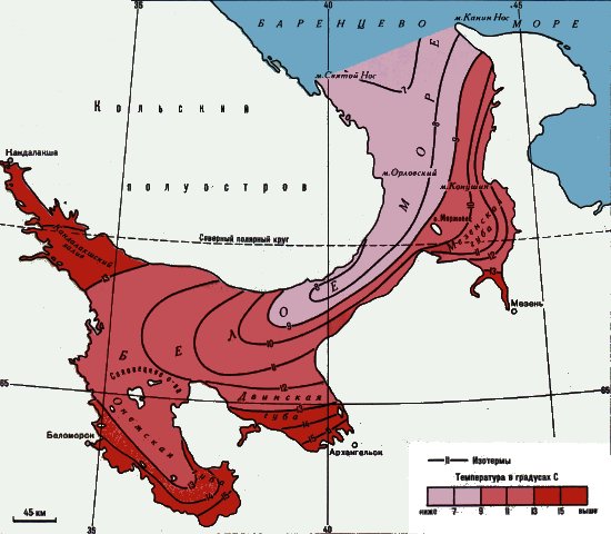 Весной после освобождения моря ото льда поверхность воды быстро нагревается. Летом лучше всего прогрета поверхность сравнительно мелководных заливов. Температура воды на поверхности Кандалакшского залива в августе равна в среднем 14—15°, в Бассейне 12— 13°. Самая низкая температура на поверхности наблюдается в Воронке и Горле, где в результате сильного перемешивания температура понижается до 7—8°.