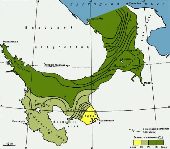 Соленость Белого моря несколько ниже средней солености океана. Ее величины неравномерно распределяются на поверхности моря, что связано с размещением речного стока, поступлением вод из Баренцева моря, переносом вод морскими течениями. Соленость увеличивается от вершин заливов к центральной части Бассейна и с глубиной, хотя в каждый сезон наблюдаются местные особенности.