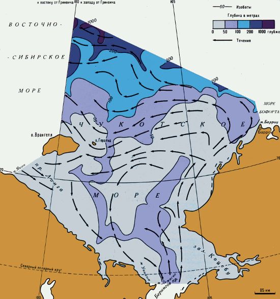 В значительно большей мере на природу Чукотского моря воздействует водообмен с Центральным полярным бассейном и с Тихим океаном через Берингов пролив. Некоторое повышение температуры воды в придонных горизонтах на севере моря связано с проникновением сюда теплых промежуточных атлантических вод.