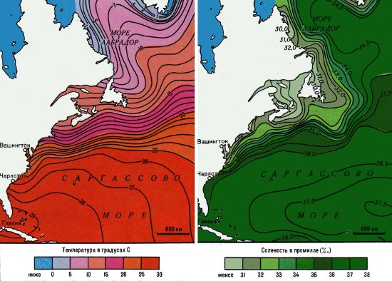 Слева: температура воды на поверхности морей Лабрадор, Саргассова летом. Справа: соленость на поверхности морей Лабрадор, Саргассова летом
