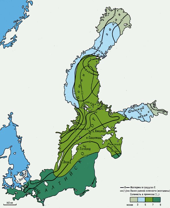 Например, в Борнхольмской котловине соленость на поверхности равна 7‰ и около 20‰ у дна. Изменение солености с глубиной происходит в основном одинаково по всему морю, за исключением Ботнического залива. В юго-западных и отчасти центральных районах моря она плавно и незначительно увеличивается от поверхности до горизонтов 30—50 м, ниже, между 60—80 м, располагается резкий слой скачка (галоклин), глубже которого соленость снова несколько увеличивается к дну. В центральной и северо-восточной частях соленость очень медленно возрастает от поверхности до горизонтов 70—80 м, глубже, на горизонтах 80—100 м, залегает гало-клин, и далее соленость слегка увеличивается до дна. В Ботническом заливе соленость повышается от поверхности до дна лишь на 1—2‰.