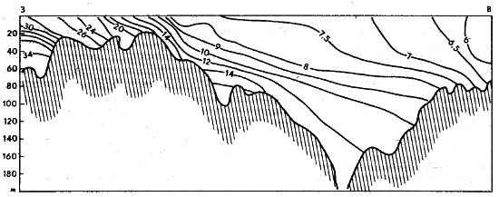 Вертикальное распределение океанологических характеристик в Балтийском море показывает, что в южных и центральных районах море разделено слоем скачка плотности на верхний (0—70 м) и нижний (от 70 м до дна) слои. В конце лета — начале осени, когда над морем преобладают слабые ветры, ветровое перемешивание распространяется до горизонтов 10—15 м в северной части моря и до горизонтов 5—10 м в центральных и южных частях и служит главным фактором формирования верхнего однородного слоя. В течение осени и зимы с увеличением скоростей ветра над морем перемешивание проникает до горизонтов 20—30 м в центральных и южных районах, а на востоке — до 10—15 м, так как здесь дуют сравнительно слабые ветры. По мере усиления осеннего охлаждения (октябрь — ноябрь) увеличивается интенсивность конвективного перемешивания. В эти месяцы в центральных и южных районах моря, в Арконской, Готландской и Борнхольмской впадинах, оно охватывает слой от поверхности примерно до 50—60 м. Здесь термическая конвекция достигает своей критической глубины (для более глубокого распространения перемешивания требуется осолонение поверхностных вод за счет льдообразования) и ограничивается слоем скачка плотности. В северной части моря, в Ботническом заливе и на западе Финского залива, где осеннее охлаждение более значительно, чем в других районах, конвекция проникает до горизонтов 60—70 м.