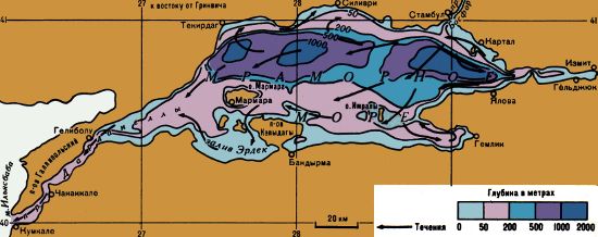 Зимой, в феврале, она имеет наиболее низкие значения, слегка повышаясь от 8° в прибосфорском районе до 9° у пролива Дарданеллы. В отдельные зимы вода возле Босфора охлаждается до 7°. В прибрежной части моря температура воды на поверхности сравнительно немного отличается от ее значений на открытых пространствах. В бухтах, защищенных от северных и северо-восточных ветров, она на 0,5—1° выше, чем в открытом море. На открытых пространствах моря температура одинакова от поверхности до горизонтов 15—20 м, затем она довольно заметно повышается до горизонтов 30—50 м, где равна примерно 10— 12°, далее идет монотонное повышение до 14° на горизонте 200 м, и до дна ее значение практически не меняется.