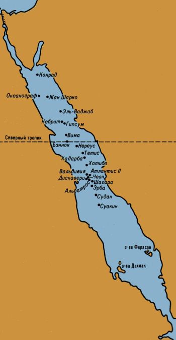 В 60-х гг. в центральной части осевого желоба, на глубинах более 2000 м, было открыто несколько впадин с горячими рассолами, обладающими своеобразным химическим составом. Происхождение этих впадин связано с тем, что в рифтовой зоне Красного моря активно проявляется современная тектоническая деятельность. За последние десятилетия в осевой зоне моря обнаружено более 15 впадин, содержащих рассолы высокой минерализации с соленостью 250‰ и более. Температура рассолов в наиболее горячей впадине Атлантис-II достигает 68°.
