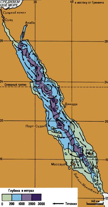В рельефе дна Красного моря четко выделяется шельф, ширина которого увеличивается с севера на юг от 10—20 до 60—100 км. На глубине 100—200 м он сменяется крутым, хорошо выраженным уступом материкового склона. Большая часть впадины Красного моря (главный желоб) лежит в интервале глубин от 500 до 2000 м. Над волнистой донной равниной возвышаются многочисленные подводные горы, гряды, местами прослеживается серия ступеней, параллельных окраинам моря. Вдоль оси впадины проходит узкая глубокая борозда — осевой желоб с максимальными для моря глубинами, представляющий собой срединную рифтовую долину Красного моря.
