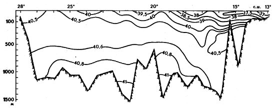 В теплый сезон температура на поверхности повышается с севера на юг от 26—27 до 32—33°, а соленость уменьшается в этом же направлении от 40—41 до 37—37,5‰.