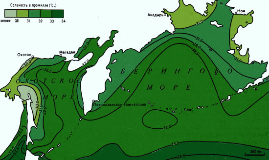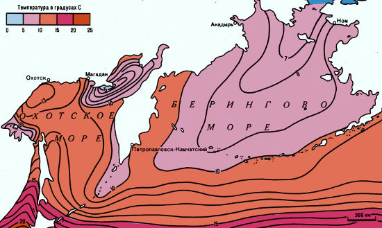 В общем температуре воды в открытой части Берингова моря свойственны относительная однородность пространственного распределения в поверхностных и глубинных слоях и сравнительно небольшие сезонные колебания, которые проявляются только до горизонтов 200—300 м.