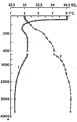 Вертикальное распределение температуры воды в открытой части моря характеризуется сезонными изменениями до горизонтов 150—200 м, глубже которых они практически отсутствуют.