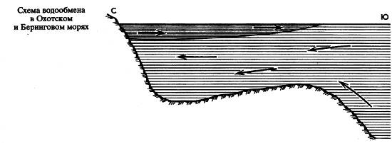 Однако водообмен через эти проливы изучен пока далеко не достаточно. Известно, что большие массы поверхностной воды выходят из моря в океан через Камчатский пролив. Подавляющая масса глубинной океанской воды поступает в море в трех районах: через восточную половину пролива Ближнего, почти через все проливы островов Лисьих и через проливы Амчитка, Танага и другие между Крысьими и Андриановскими островами. Возможно, что более глубокие воды проникают в море и через Камчатский пролив, если не постоянно, то периодически или спорадически. Водообмен между морем и океаном влияет на распределение температуры, солености, формирование структуры и общей циркуляции вод Берингова моря.