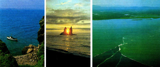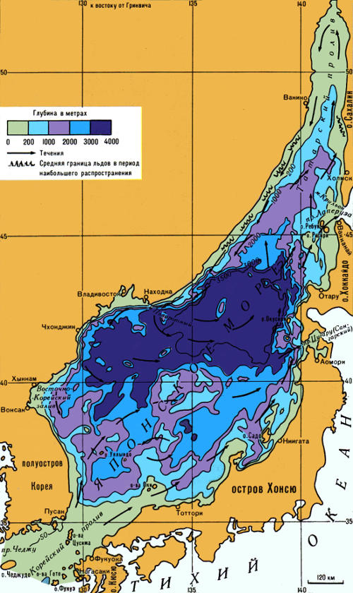 По мере продвижения на север характеристики тихоокеанской воды постепенно изменяются под влиянием климатических факторов в результате перемешивания ее с подстилающей глубинной япономорской водой. При охлаждении и распреснении тихоокеанской воды на широтах 46—48° с.ш. формируется поверхностная япономорская водная масса. Она характеризуется относительно низкой температурой (в среднем около 5—8°) и соленостью (32,5— 33,5‰). Вся толща этой водной массы делится на три слоя: поверхностный, промежуточный и глубинный. Как и в тихоокеанской, в поверхностной японо-морской воде наибольшие изменения гидрологических характеристик происходят в поверхностном слое толщиной от 10 до 150 м и более. Температура здесь в течение года меняется от 0 до 21°, соленость — от 32 до 34‰. В промежуточном и глубинном слоях сезонные изменения гидрологических характеристик незначительны.