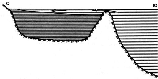 верхний промежуточный слой имеет толщину, изменяющуюся от 50 до 150 м. В нем отмечаются значительные градиенты температуры, солености и плотности;