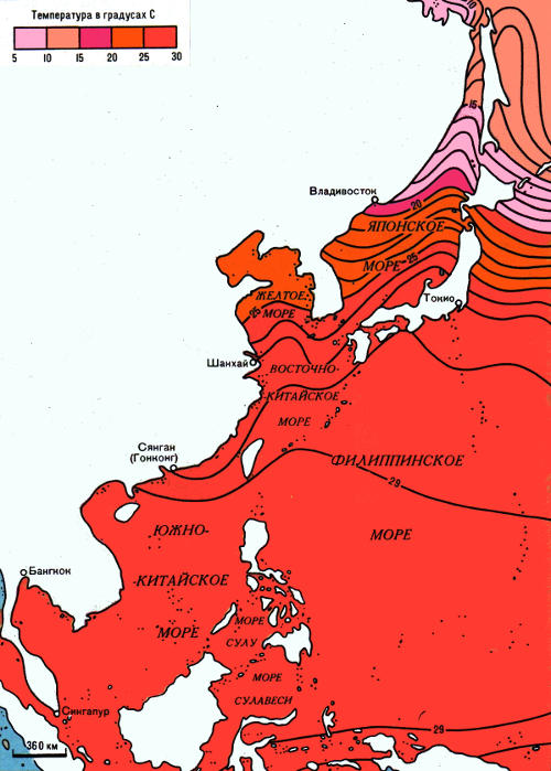 Температура воды на поверхности морей Японского, Желтого, Восточно-Китайского, Южно-Китайского, Филиппинского, Сулу, Сулавеси летом