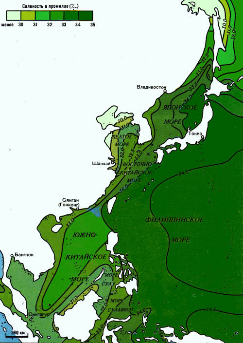 Средняя соленость Японского моря, равная примерно 34,1‰, несколько ниже средней солености вод Мирового океана.