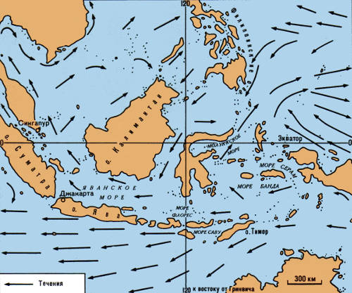 Течения на поверхности в открытом море возбуждает главным образом ветер, а в прибрежных районах сказывается влияние приливов. Поэтому и циркуляция поверхностных вод открытого моря носит муссонный характер.