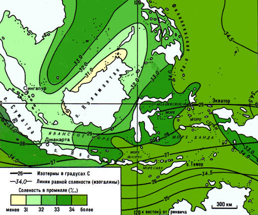 Расслоение вод по плотности, скорость и продолжительность ветра, осолонение морской поверхности за счет испарения обусловливают интенсивность перемешивания в Яванском море. Преобладающие над морем муссонные ветры характеризуются преимущественно небольшими скоростями и при существующем вертикальном распределении плотности перемешивают лишь самый верхний слой (10—15 м) в открытых районах моря. В прибрежных, более стратифицированных по плотности районах ветер перемешивает поверхностные воды до горизонтов 5—7 м во время северо-западного муссона и слой примерно до 10 м при юго-восточном муссоне, когда плотностная переслоенность вод выражена менее резко, чем в предшествующий сезон. Испарение с поверхности моря, примерно равное осадкам, вызывает сравнительно небольшое осолонение, поэтому в море конвекция развита относительно слабо. Суммарное конвективно-ветровое перемешивание распространяется до горизонтов 40— 50 м в открытых районах моря и до 10— 15 м в его прибрежной, более резко стратифицированной части. Глубже горизонта 50 м развит довольно четкий скачок плотности, непреодолимый для конвективно-ветрового перемешивания. Глубже перемешивание происходит в процессе общей циркуляции вод Яванского моря.