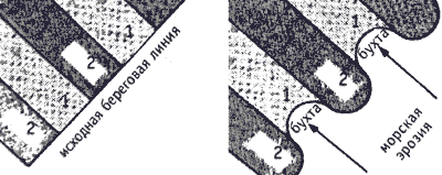 Бухта. Условия формирования. 1 – легко размываемые породы, 2 – трудно размываемые породы.
