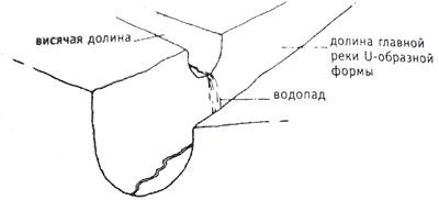 Висячая долина – боковая долина, днище которой не сливается с днищем главной долины на одном уровне, а оканчивается на некоторой высоте над ним. Часто встречаются в горах, подвергавшихся в прошлом оледенению, где являются результатом переуглубления главных трогов. Во время оледенения эрозия в долине главной реки значительно больше, нежели в маленьких долинах ее притоков.