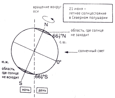 Вращение Земли (суточное) – одна из составляющих движения Земли. Вращение Земли вокруг своей оси. Относительно звезд Земля вращается с периодом 23 ч 56 мин 4 с среднего солнечного времени (звездные сутки). Вследствие вращения Земли на тела, движущиеся по ее поверхности, действует сила Кориолиса. Влияние этой силы проявляется в подмывании правых берегов рек в Сев. полушарии и левых – в Южном и в некоторых особенностях движения атмосферы. Из-за наклона земной оси продолжительность дня и ночи в различных точках планеты неодинакова. На рис. изображена ситуация летнего солнцестояния в Северном полушарии и зимнего солнцестояния в Южном полушарии. В это время на экваторе продолжительность дня и ночи одинакова и составляет 12 часов. Севернее 66° с.ш. солнце не заходит за горизонт (полярный день), южнее 66° ю.ш. солнце не всходит (полярная ночь). Дни становятся длиннее при движении от экватора к Северному полюсу и короче при движении к Южному полюсу.