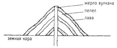 Вулкан – геологическое образование, возникающее над каналами и трещинами в земной коре, по которым извергаются на земную поверхность из глубинных магматических очагов лавы, горячие газы, пары воды и обломки горных пород. По характеру деятельности различают действующие, уснувшие и потухшие вулканы; по форме – центральные, трещинные, щитообразные. Центральный вулкан, образованный излиянием кислой (медленно текущей и быстро застывающей) лавы, характеризуется крутыми склонами. Центральный смешанный вулкан имеет, как правило, одно жерло и склоны, сложенные попеременно слоями лавы и пепла, например, вулканы Везувий и Этна.